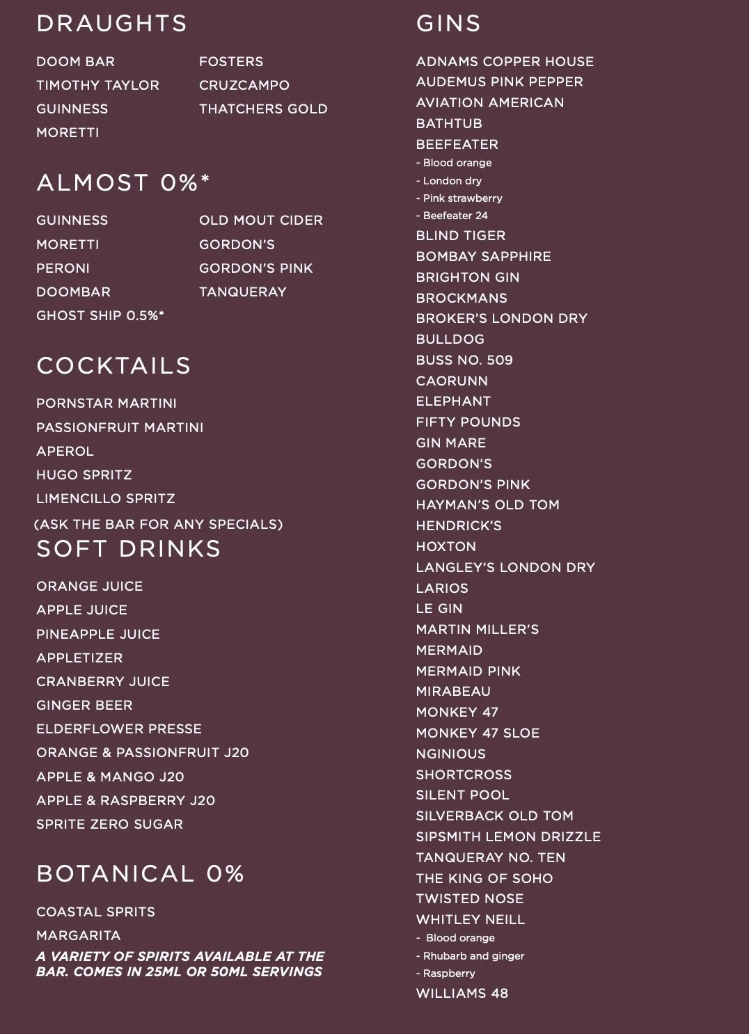 A bar menu listing drinks categorized under 'Draughts,' 'Almost 0%,'' 'Cocktails,' 'Soft Drinks,' and 'Botanical 0%.'' The menu includes various beers, ciders, cocktails, and soft drinks, with some special notes about spirit options.
